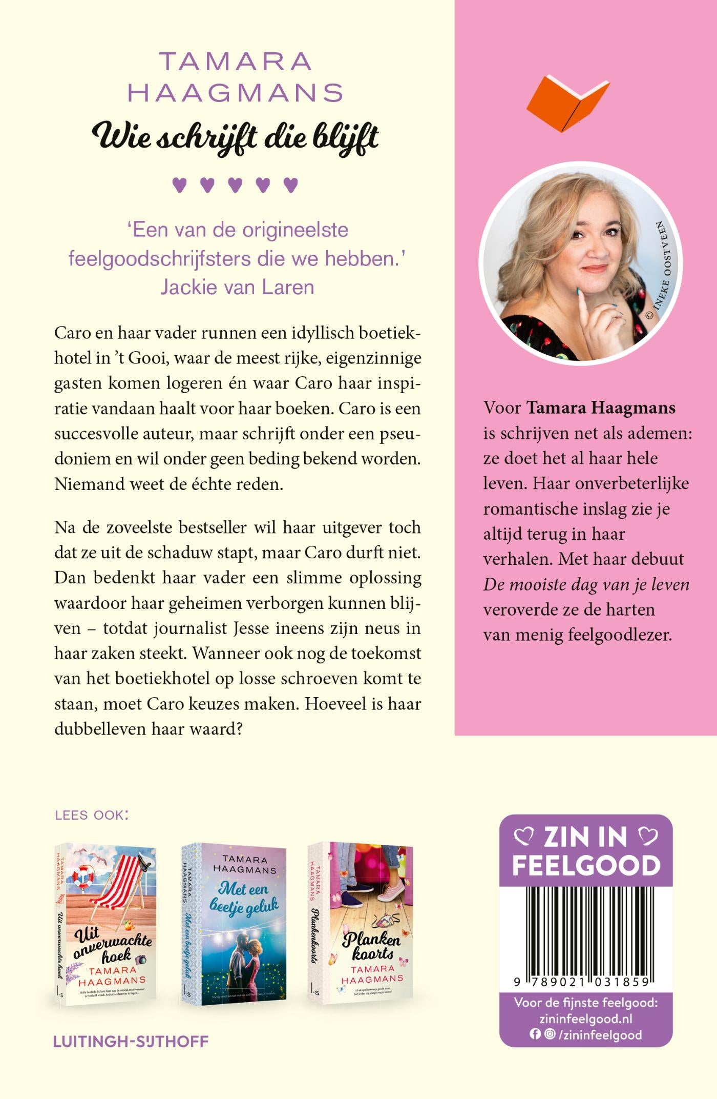 In Wie schrijft die blijft van Tamara Haagmans volgen we Caro, die samen met haar vader een idyllisch boetiekhotel in ’t Gooi runt, waar de meest rijke, eigenzinnige gasten komen logeren én waar Caro haar inspiratie vandaan haalt voor haar boeken. Caro is een succesvolle auteur, maar schrijft onder een pseudoniem en wil onder geen beding bekend worden. Niemand weet de échte reden.