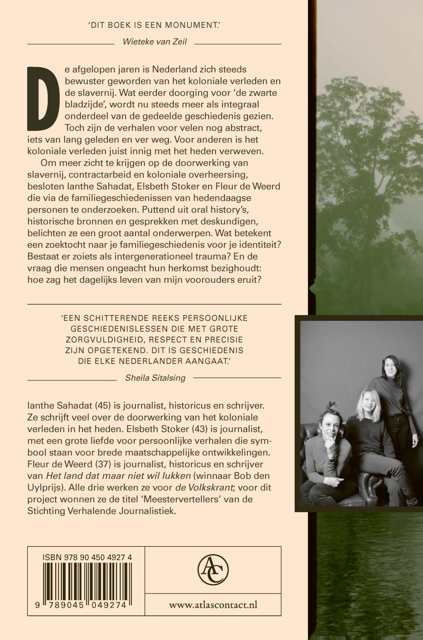 Om meer zicht te krijgen op de doorwerking van slavernij, contractarbeid en koloniale overheersing, besloten Ianthe Sahadat, Elsbeth Stoker en Fleur de Weerd die via de familiegeschiedenissen van hedendaagse personen te onderzoeken. Puttend uit oral history’s, historische bronnen en gesprekken met deskundigen, belichten ze een groot aantal onderwerpen. Wat betekent een zoektocht naar je familiegeschiedenis voor je identiteit? Bestaat er zoiets als intergenerationeel trauma? En de vraag die mensen ongeacht hun herkomst bezighoudt: hoe zag het dagelijks leven van mijn voorouders eruit?