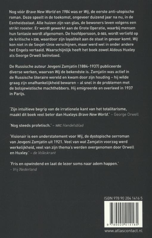 Nog vóór Brave New World en 1984 was er 'Wij', geschreven door Jevgeni Zamjatin, de eerste anti-utopische roman. Hij speelt in de toekomst, ongeveer duizend jaar na nu, in de Eenheidsstaat. Alle huizen zijn van glas, de bewoners leven volgens een strikt rooster. Er wordt gewerkt aan de Grote Operatie, waarbij mensen hun fantasie wordt afgenomen. De hoofdpersoon, d-503, wordt verliefd op de kritische i-330, waardoor zijn loyaliteit aan de staat in gevaar komt. 'Wij' kon niet in de Sovjet-Unie verschijnen, maar werd wel in onder andere het Engels vertaald. Waarschijnlijk heeft het boek zowel Aldous Huxley als George Orwell beïnvloed.