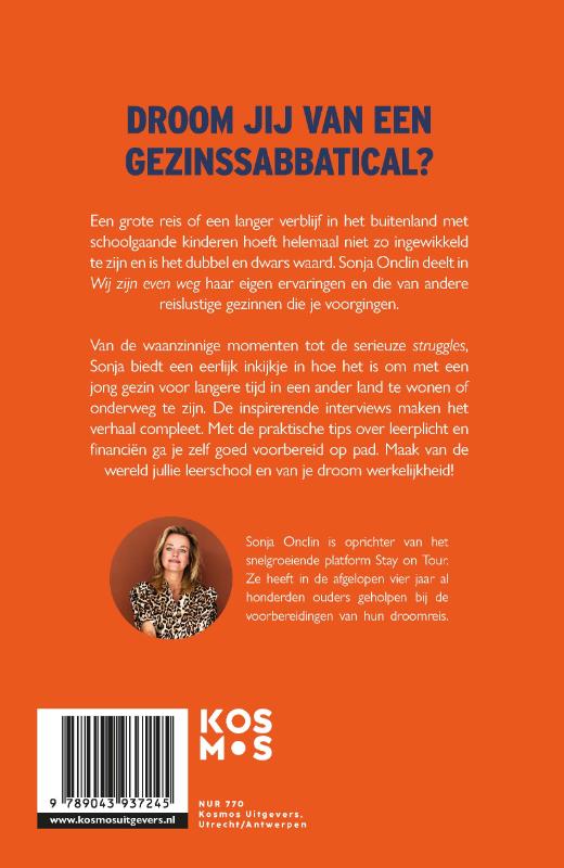 In Wij zijn even weg deelt Sonja Onclin haar eigen ervaringen en die van andere reislustige gezinnen die je voorgingen. Een grote reis of een langer verblijf in het buitenland met schoolgaande kinderen hoeft helemaal niet zo ingewikkeld te zijn en is het dubbel en dwars waard.
