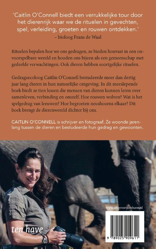 'Wilde rituelen' van Caitlin O'Connell bevat tien lessen die mensen van dieren kunnen leren over samenleven, verbinding en onszelf. Het is een fascinerend boek dat de dierenwereld dichter bij ons brengt. O’Connell vertelt welke rituelen dieren volgen als ze elkaar begroeten, verleiden of als ze rouwen. Het gemeenschapsgevoel van zebra’s, olifanten en chimpansees leert ons wat in onze op het individu gerichte samenleving hard nodig is. Dieren leren ons te leven. De auteur woonde jarenlang tussen de dieren: Jane Goodall meets Frans de Waal.