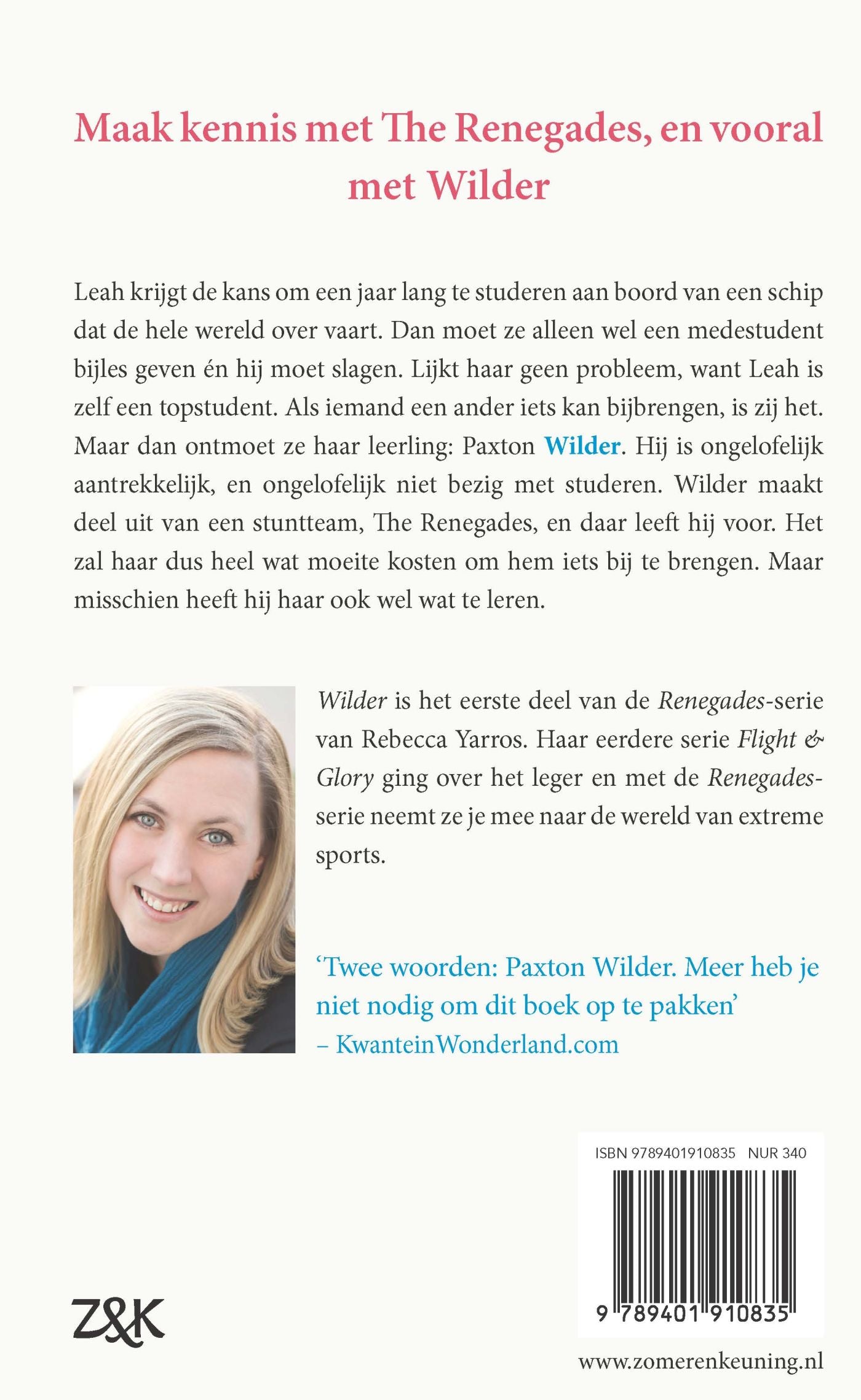 Het eerste deel van Rebecca Yarros’ Renegades-serie, ‘Wilder’, gaat over Leah. Zij krijgt de kans om een jaar lang te studeren aan boord van een cruiseschip dat de hele wereld over vaart. De enige voorwaarde? Een medestudent bijles geven en zorgen dat hij ook slaagt. Dat dit makkelijker is gezegd dan gedaan, blijkt al snel als ze haar leerling ontmoet. Paxton Wilder is ongelofelijk aantrekkelijk, en ongelofelijk niet bezig met studeren. Wilder maakt deel uit van een stuntteam, de Renegades, en dat is voor hem het enige wat telt. Ervoor zorgen dat hij zijn studie serieus gaat nemen zal haar dus behoorlijk wat moeite kosten. Maar misschien heeft hij haar ook wel wat te leren. Een originele new adult van Rebecca Yarros, de auteur die bekend werd met de Flight & Glory-serie.