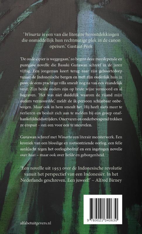 'De oude cipier is weggegaan,’ zo begint deze meeslepende en puntgave novelle die Basuki Gunawan schreef in de jaren vijftig. Een jongeman keert terug naar zijn geboortedorp vanuit de Indonesische bergen en treft zijn ouderlijk huis in puin; de eens prachtige villa smeult nog na van een vijandelijk vuur. Zijn beide ouders zijn op brute wijze vermoord en al begraven. ‘Het was niet duidelijk waarom de vijand mijn ouders vermoordde’, meldt de ik-persoon schijnbaar onbewogen. Maar ook in hem smeult het. Hij heeft niets meer te verliezen en besluit zich aan te melden bij een groep onafhankelijkheidsstrijders. Onervaren en onderbewapend trekken ze eropuit – om een voor een te sneuvelen. Gunawan schreef met Winarta een literair meesterwerk. Een kroniek van een bloedige en nietsontziende oorlog, een felle aanklacht tegen het oorlogsbedrijf en een ingetogen novelle over haat – maar ook over liefde en geborgenheid.