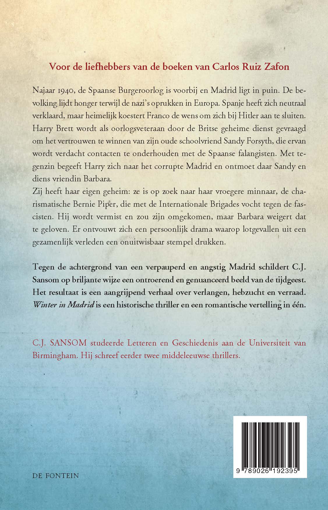 Najaar 1940, de Spaanse Burgeroorlog is voorbij en Madrid ligt in puin. De bevolking lijdt honger terwijl de nazi's oprukken in Europa. Spanje heeft zich neutraal verklaard, maar heimelijk koestert Franco de wens om zich bij Hitler aan te sluiten. Harry Brett wordt als oorlogsveteraan door de Britse geheime dienst gevraagd om het vertrouwen te winnen van zijn oude schoolvriend Sandy Forsyth, die ervan wordt verdacht louche contacten te onderhouden met de Spaanse falangisten. Met enige tegenzin begeeft Harry zich naar het corrupte Madrid en ontmoet daar Sandy en diens vriendin Barbara Clare. Barbara heeft haar eigen geheim: zij is op zoek naar haar vroegere minnaar, de charismatische Bernie Piper, die met de Internationale Brigades vocht tegen de fascisten. Hij wordt vermist en zou zijn omgekomen, maar Barbara weigert dat te geloven. Er ontvouwt zich een persoonlijk drama waarop lotgevallen uit een gezamenlijk verleden een onuitwisbaar stempel drukken. Tegen de achtergrond van een verpauperd en angstig Madrid schildert C.J. Sansom op briljante wijze een ontroerend en genuanceerd beeld van de tijdgeest. Het resultaat is een aangrijpend verhaal over verlangen, hebzucht en verraad. Winter in Madrid is een historische thriller en een romantische vertelling in één. C.J. SANSOM studeerde Letteren en Geschiedenis aan de Universiteit van Birmingham. Hij schreef eerder twee Middeleeuwse thrillers. 'Een intelligent boek, goed en sfeervol geschreven. Uitzonderlijk goed.' Vrij Nederland, vijf sterren 'Een overtuigende en ontroerende historische roman, en tegelijkertijd een spannende thriller.' Sunday Times
