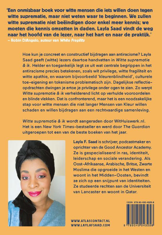 In ‘Witte suprematie & ik’ stelt Layla Saad maatschappelijke machtsverhoudingen aan de kaak en hoe daarmee om te gaan. Hoe kun je concreet en constructief bijdragen aan antiracisme? Saad geeft (witte) lezers daartoe handvatten in ‘Witte suprematie & ik’. Helder en toegankelijk legt ze uit wat centrale begrippen in het antiracisme precies betekenen, zoals wit privilege, witte fragiliteit en witte apathie, en waarom bijvoorbeeld ‘kleurenblindheid’, culturele toe-eigening en tokenisme problematisch zijn. Dagelijkse reflectieopdrachten dwingen je ertoe je privilege onder ogen te zien. Zo werpt ‘Witte suprematie & ik’ verhelderend licht op verhulde vooroordelen en blinde vlekken. Dat is confronterend, maar het is een noodzakelijke stap voor witte mensen die niet langer Mensen van Kleur willen schaden en willen bijdragen aan een rechtvaardige samenleving.