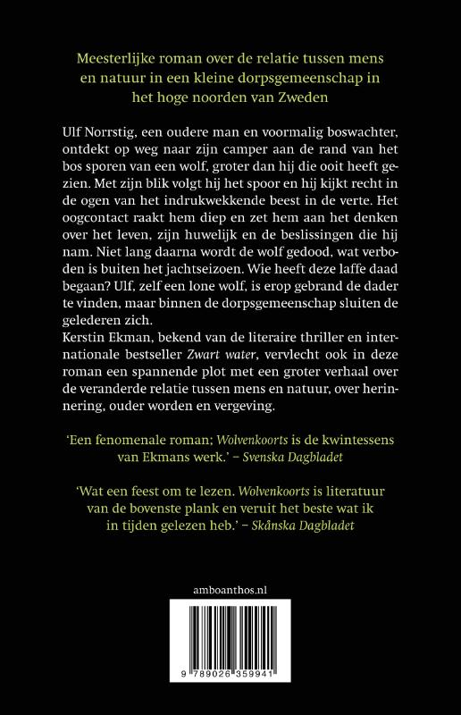 Kerstin Ekman grande dame van de Zweedse literatuur en bekend van de literaire thriller en internationale bestseller Zwart water, keert met Wolvenkoorts terug met een meesterlijke roman over de relatie tussen mens en natuur in een kleine dorpsgemeenschap in het hoge noorden van Zweden, over ouder worden en wat het betekent mens te zijn.
