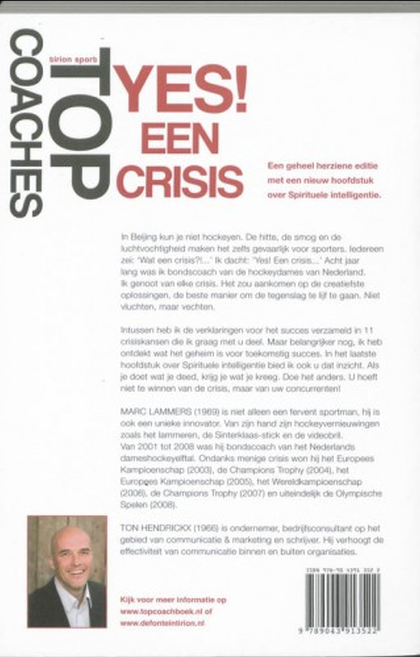 Voor Marc Lammers, die als coach met het Nederlandse dameshockeyteam in 2008 Olympisch goud won in Beijing, is een ding duidelijk: elke crisis betekent een kans! Zo bekeken is de mondiale financiele crisis een zegen, voor zowel de (top)sport als het bedrijfsleven. In 'Yes! Een crisis' vertelt Lammers over de heilzame werking die crisissituaties kunnen hebben. Met vele concrete praktijkvoorbeelden laat hij zien dat elke crisis nieuwe mogelijkheden en uitdagingen biedt - niet alleen in de sport, maar ook in het bedrijfsleven. Je hoeft niet te winnen van de crisis, maar van je concurrenten! In deze nieuwste editie onthult Lammers bovendien het geheim van gegarandeerd succes. In een nieuw toegevoegd hoofdstuk leert de lezer alles over Spirituele Intelligentie. Als je doet wat je deed, krijg je wat je kreeg. Conclusie: doe het anders!