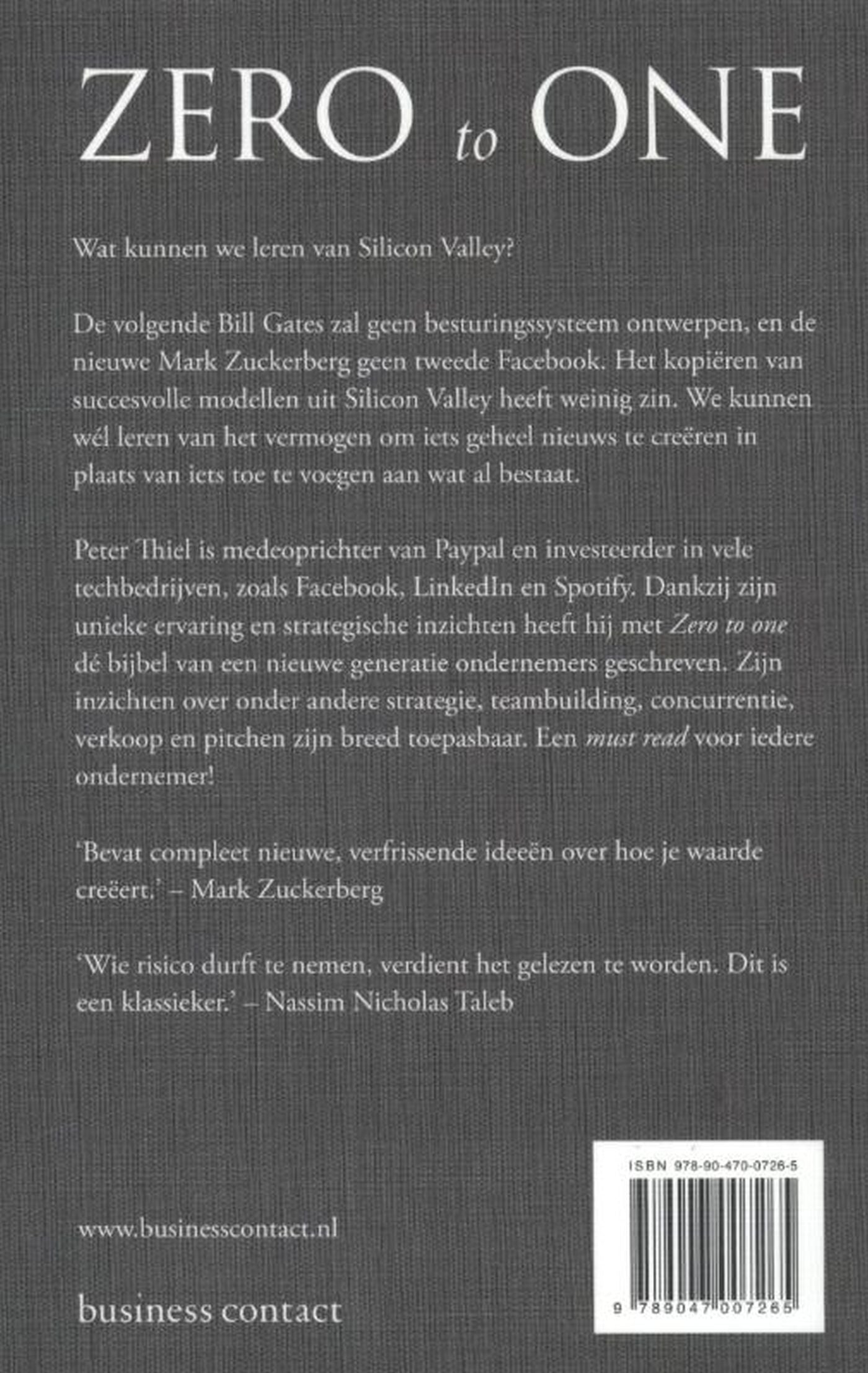 Peter Thiel is medeoprichter van PayPal en investeerder in vele techbedrijven, zoals Facebook, LinkedIn en Spotify. Dankzij zijn unieke ervaring en strategische inzichten heeft hij met Zero to one dé bijbel van een nieuwe generatie ondernemers geschreven. Zijn inzichten over onder andere strategie, teambuilding, concurrentie, verkoop en pitchen zijn breed toepasbaar. Een must read voor iedere ondernemer!