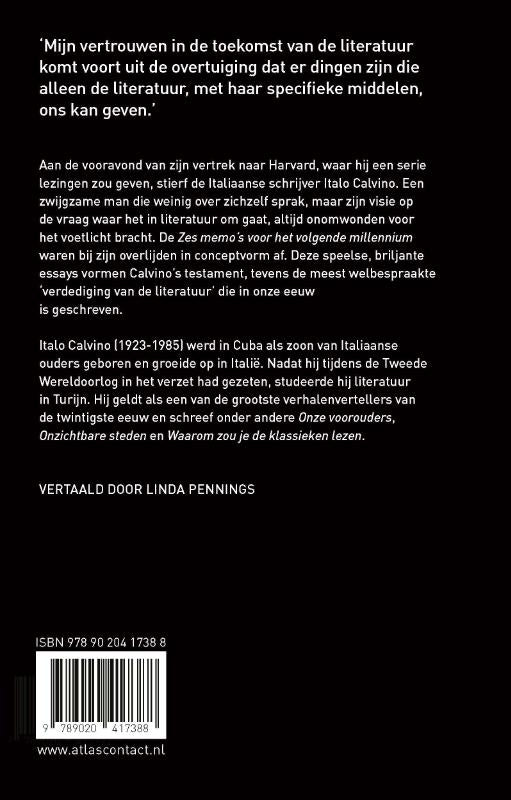 in conceptvorm af. Deze speelse, briljante essays vormen Calvino’s testament, tevens de meest welbespraakte ‘verdediging van de literatuur’ die in onze eeuw is geschreven.