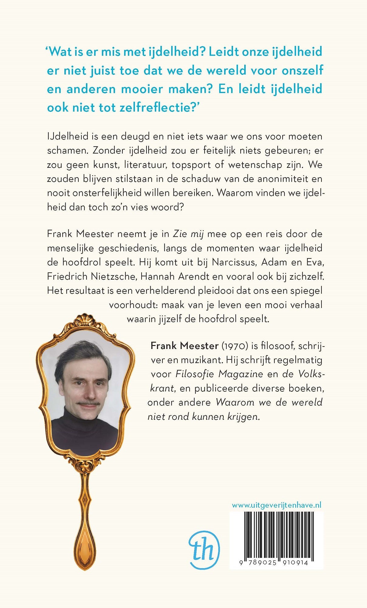 In ‘Zie mij’ laat Frank Meester zien dat ijdelheid niet iets is waar we ons voor moeten schamen. Zonder ijdelheid gebeurt er feitelijk niets, was er geen kunst, literatuur, topsport of wetenschap. Meester neemt de lezer mee op een reis door de menselijke geschiedenis, steeds weer is hij op zoek naar die momenten waar ijdelheid de hoofdrol speelt. Het resultaat is een even sprankelend als verhelderend pleidooi: maak van je leven een mooi verhaal waarin je zelf de hoofdrol speelt.