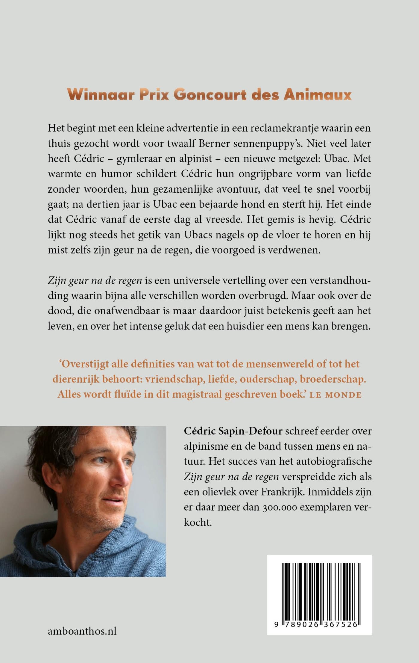 Zijn geur na de regen is een universele vertelling over een verstandhouding waarin bijna alle verschillen worden overbrugd. Maar ook over de dood, die onafwendbaar is maar daardoor juist betekenis geeft aan het leven, en over het intense geluk dat een huisdier een mens kan brengen.