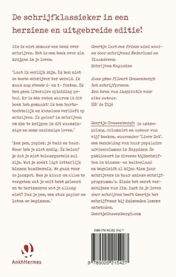 Deze nieuwe versie van ZIN is helemaal herzien en uitgebreid. Geertje Couwenbergh neemt je mee in haar liefde voor schrijven en of je nu een beginner of een expert bent: door schrijven krijg je ZIN in dit waanzinnige en soms onzinnige leven!