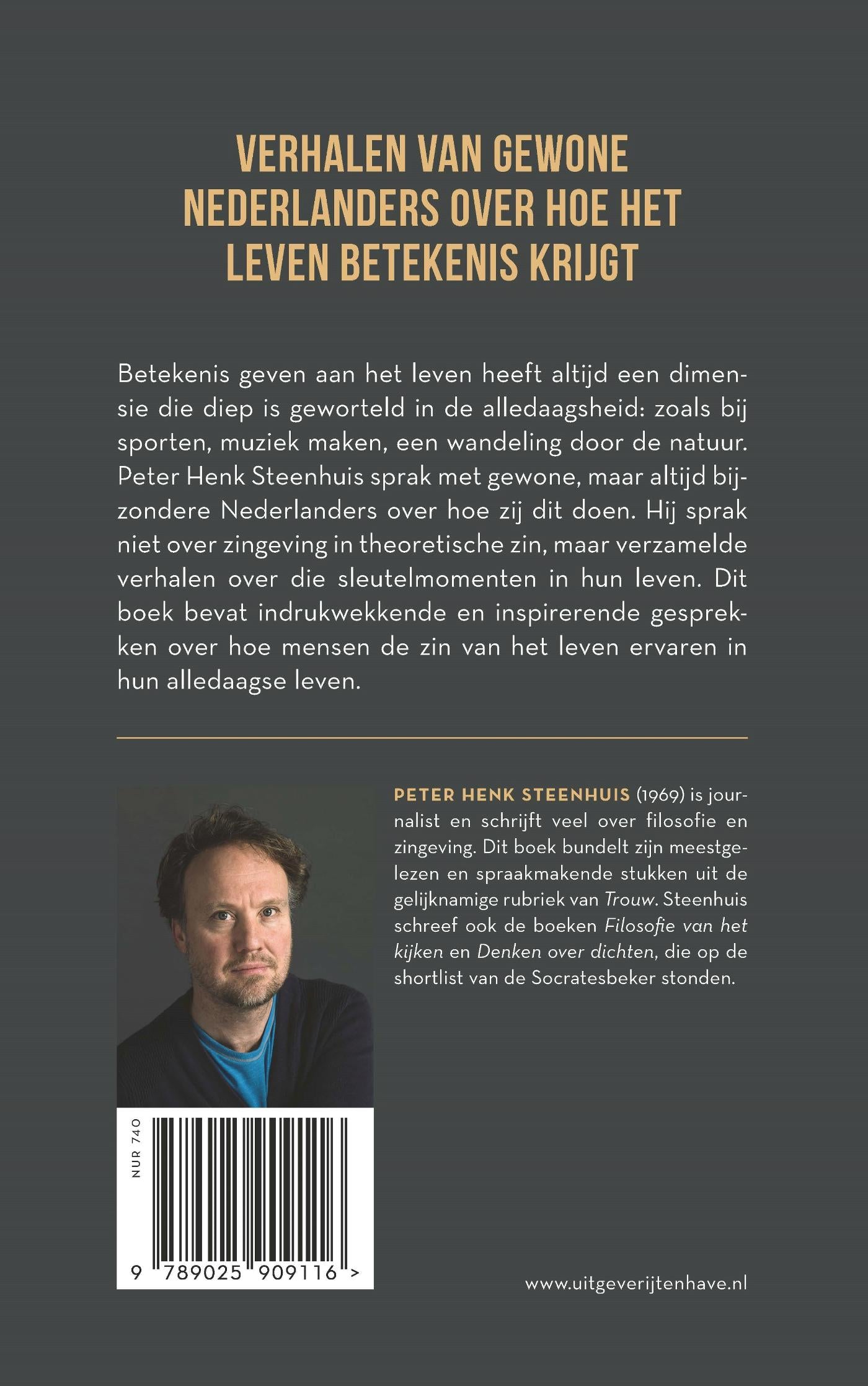‘Zin in het alledaagse’ bevat gesprekken met gewone, maar altijd bijzondere Nederlanders over hoe zij hun leven betekenis geven. Peter Henk Steenhuis sprak met hen niet over zingeving in theoretische zin, maar verzamelde verhalen over de manier waarop zij zin doen. Betekenis geven aan het leven heeft altijd een dimensie die is geworteld in het dagelijkse leven: zoals bij sporten en muziekmaken. Dit boek bundelt de meestgelezen stukken uit de spraakmakende gelijknamige rubriek in Trouw.