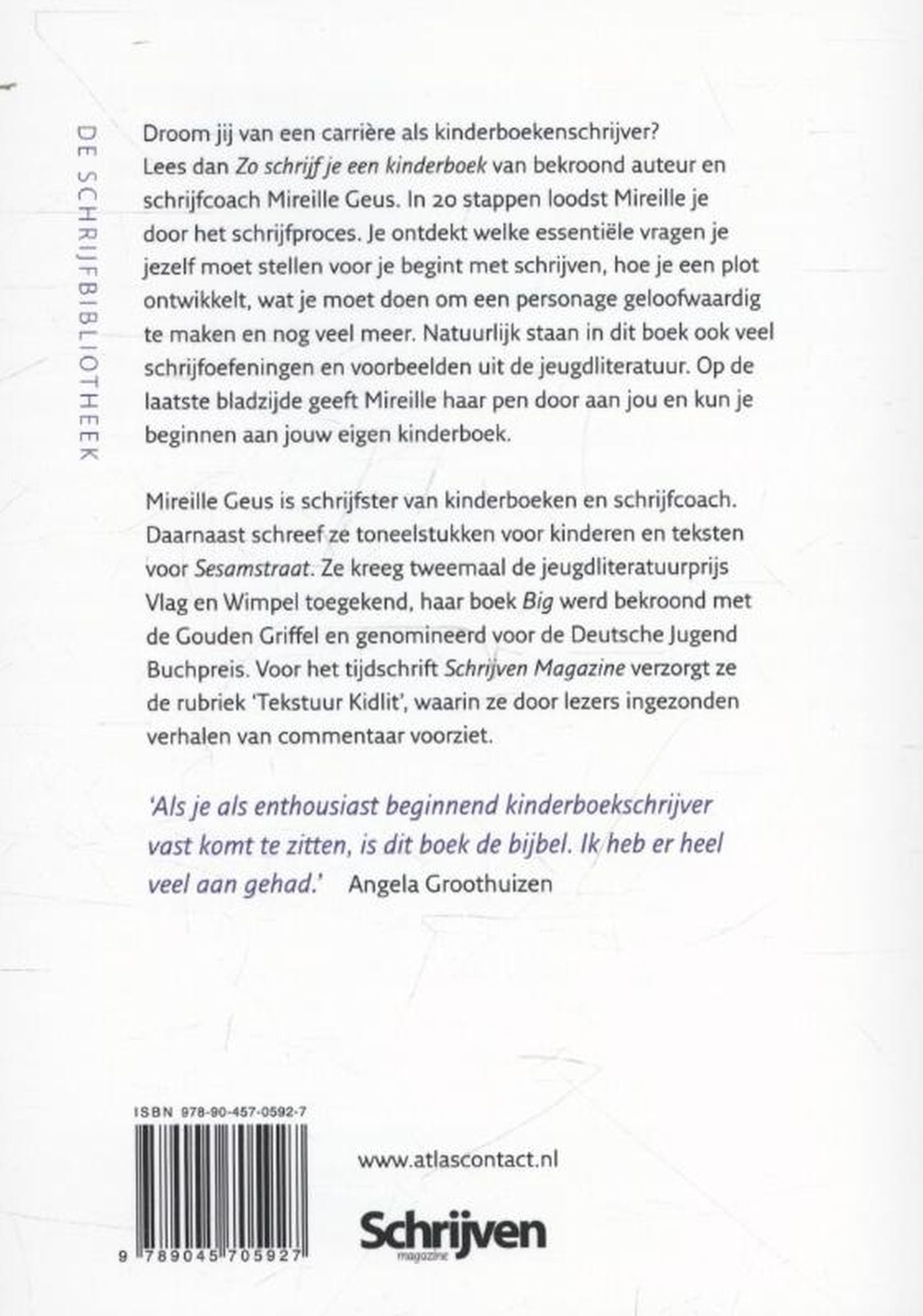 Lees dan Zo schrijf je een kinderboek van bekroond auteur en schrijfcoach Mireille Geus. In 20 stappen loodst Mireille je door het schrijfproces. Je ontdekt welke essentiële vragen je jezelf moet stellen voor je begint met schrijven, hoe je een plot ontwikkelt, wat je moet doen om een personage geloofwaardig te maken en nog veel meer. Natuurlijk staan in dit boek ook veel schrijfoefeningen en voorbeelden uit de jeugdliteratuur. Op de laatste bladzijde geeft Mireille haar pen door aan jou en kun je beginnen aan jouw eigen kinderboek.