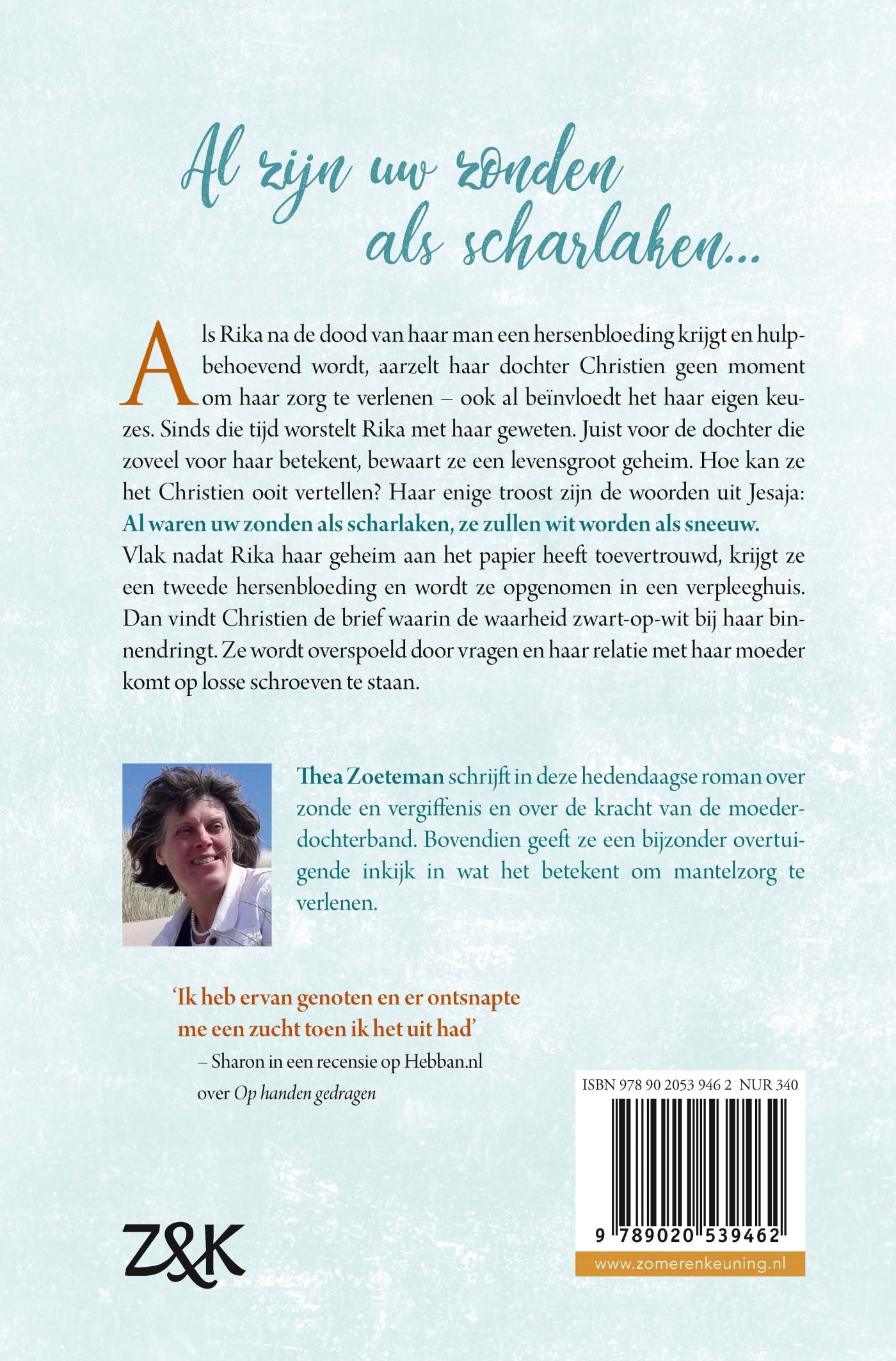 'Zo wit als sneeuw' van Thea Zoeteman gaat over Rika, die na een hersenbloeding mantelzorg nodig heeft. Haar dochter Christien neemt dit op zich. Rika is dankbaar, maar voelt zich ook schuldig. Ze heeft een groot geheim dat zwaar op haar drukt. Dan ontdekt Christien het en blijft ze plots weg. Thea Zoeteman schrijft in de hedendaagse roman 'Zo wit als sneeuw' over zonde en vergiffenis en over de kracht van de moeder-dochterband.