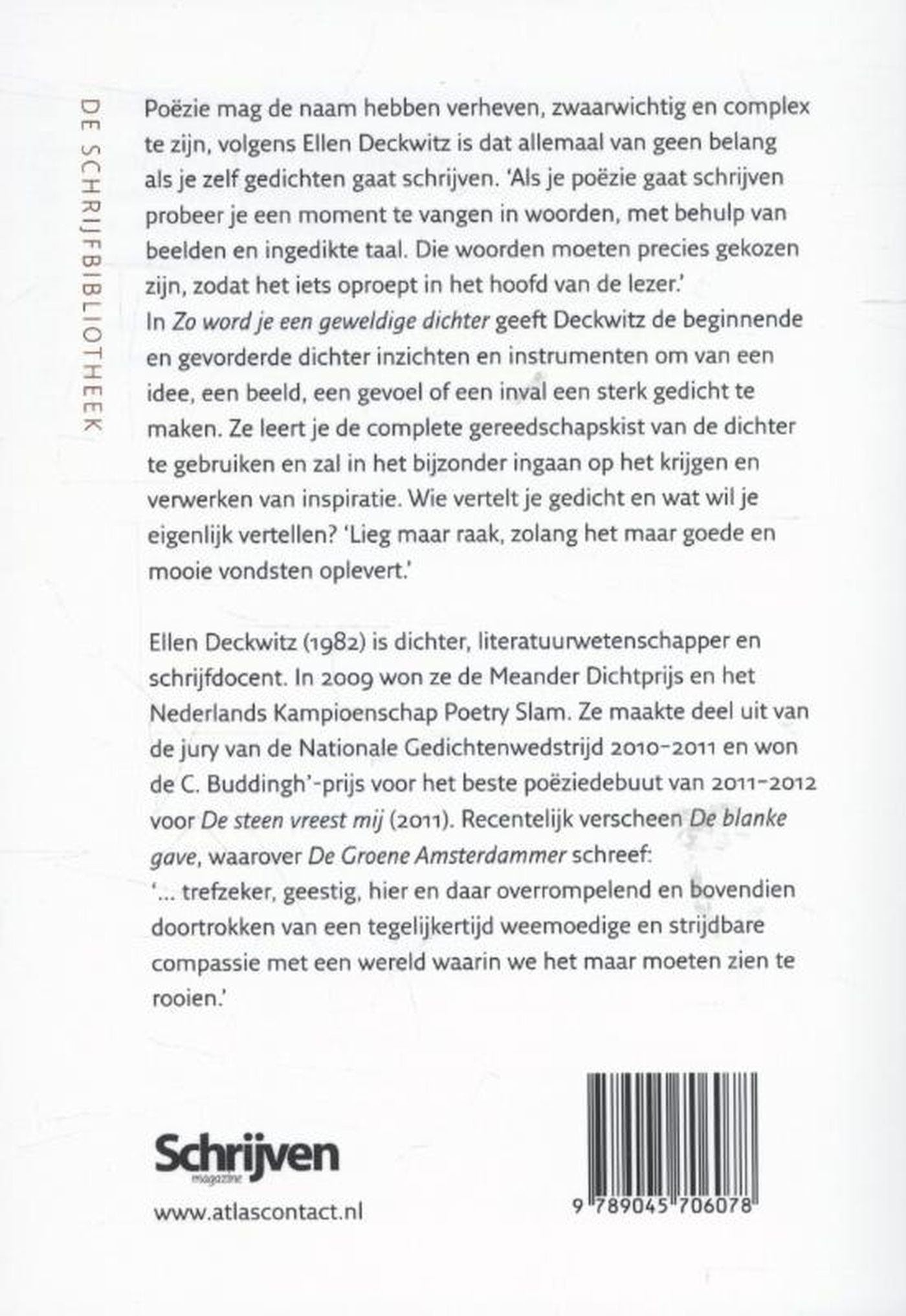 In Zo word je een geweldige dichter geeft Deckwitz de beginnende en gevorderde dichter inzichten en instrumenten om van een idee, een beeld, een gevoel of een inval een sterk gedicht te maken. Ze leert je de complete gereedschapskist van de dichter te gebruiken en zal in het bijzonder ingaan op het krijgen en verwerken van inspiratie. Wie vertelt je gedicht en wat wil je eigenlijk vertellen? ‘Lieg maar raak, zolang het maar goede en mooie vondsten oplevert.’