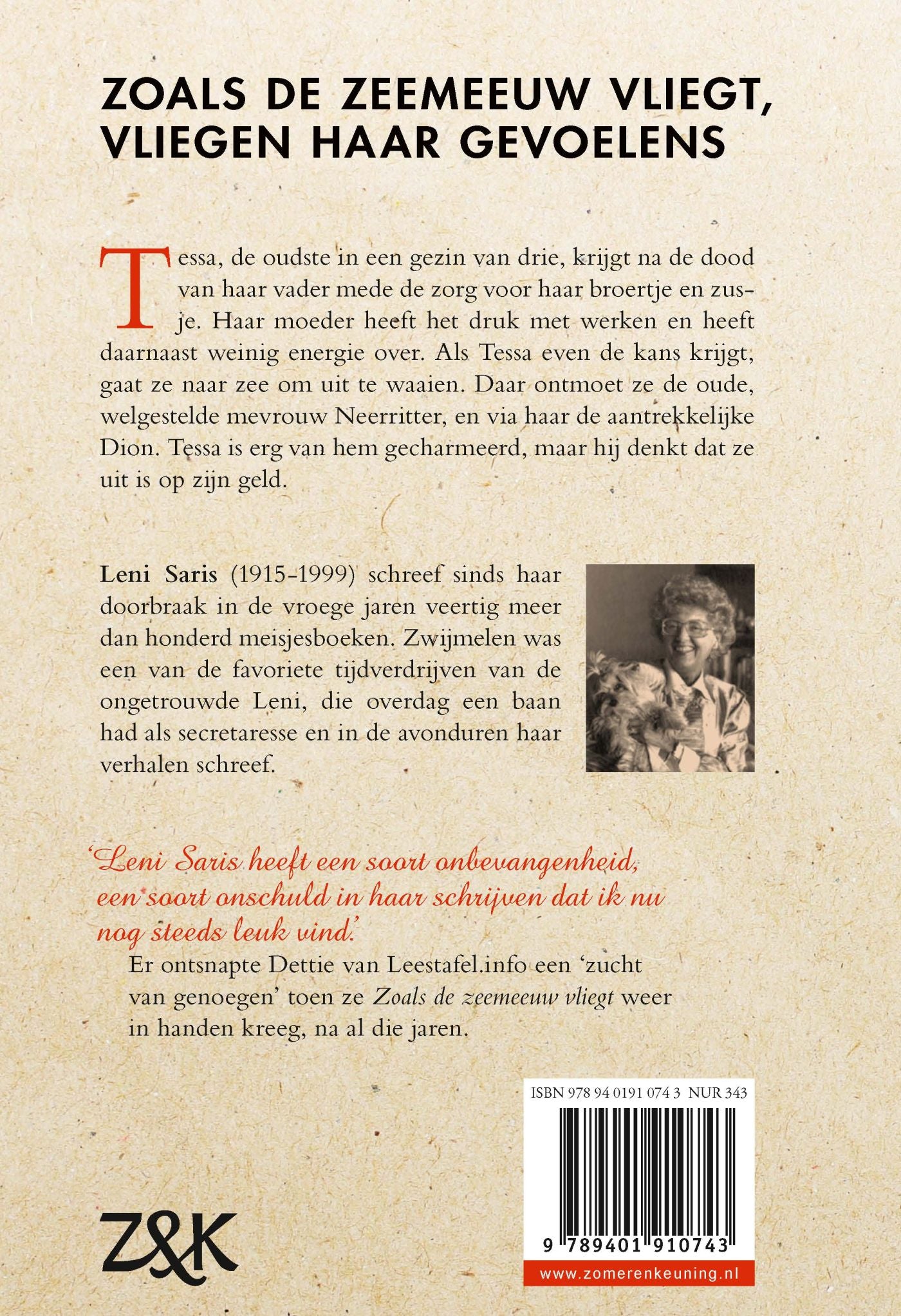 Pure nostalgie, dat is Leni Saris. Haar naam roept gevoelens op van warmte en vreugde, haar boeken van heerlijke onbezorgdheid. Zo ook Zoals de zeemeeuw vliegt. Hoofdpersoon Tessa, de oudste in het gezin, krijgt na de dood van haar vader mede de zorg voor haar broertje en zusje. Haar moeder heeft het druk met werken en heeft daarnaast weinig energie over. Als Tessa even de kans krijgt, gaat ze naar zee om uit te waaien. Daar ontmoet ze de oude, welgestelde mevrouw Neerritter, en via haar de aantrekkelijke Dion. Tessa is erg van hem gecharmeerd, maar hij denkt dat ze uit is op zijn geld. Zoals de zeemeeuw vliegt van Leni Saris is een ongecompliceerd meisjesboek voor puur, ontspannen leesplezier.