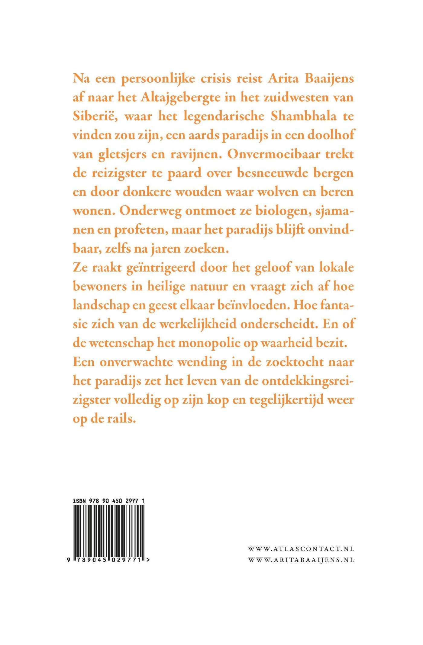 'Zoektocht naar het paradijs' van Arita Baaijens is een onderzoek naar waarheid en werkelijkheid in het hart van Centraal-Azië. Na een persoonlijke crisis reist Arita Baaijens af naar het Altajgebergte in het zuidwesten van Siberië, waar het legendarische Shambhala te vinden zou zijn, een aards paradijs in een doolhof van gletsjers en ravijnen. Onvermoeibaar trekt de reizigster te paard over besneeuwde bergen en door donkere wouden waar wolven en beren wonen. Onderweg ontmoet ze keelzangers, stoere herders, biologen, sjamanen, kluizenaars, professoren en profeten, maar het paradijs blijft onvindbaar, zelfs na jaren zoeken. Baaijens raakt geïntrigeerd door het geloof van lokale bewoners in de heilige natuur en vraagt zich af hoe landschap en geest elkaar beïnvloeden. Hoe fantasie zich van de werkelijkheid onderscheidt. En of wetenschap het monopolie op waarheid bezit. ‘De zoektocht naar het paradijs’ zet het leven van de ontdekkingsreizigster weer op de rails.