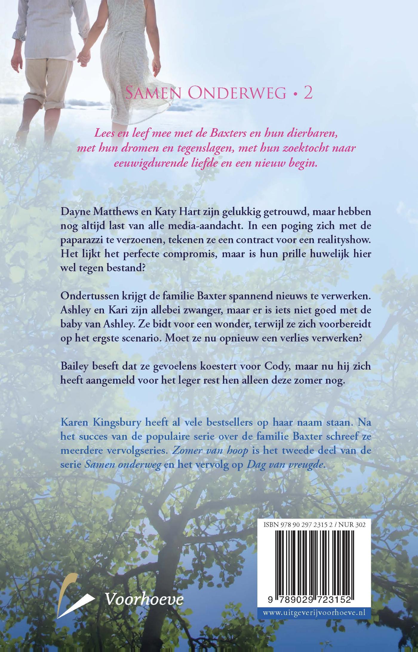 ‘Zomer van hoop’ is het tweede deel in de serie ‘Samen onderweg’ van Karen Kingsbury en het vervolg op ‘Dag van vreugde’. Acteur Dayne Matthews en Katy Hart zijn gelukkig getrouwd, maar zijn nog altijd niet vrij van alle media-aandacht. In een poging zich te verzoenen met de paparazzi, tekenen ze een contract voor een realityshow. Het lijkt het perfecte compromis, maar al snel raken ze alles kwijt wat ze met zoveel zorg hebben opgebouwd. De familie Baxter krijgt spannend nieuws te verwerken. Ashley en Kari zijn allebei zwanger, maar er is iets niet goed met een van de baby’s. De zussen bidden voor een wonder, terwijl ze zich voorbereiden op het ergste scenario.