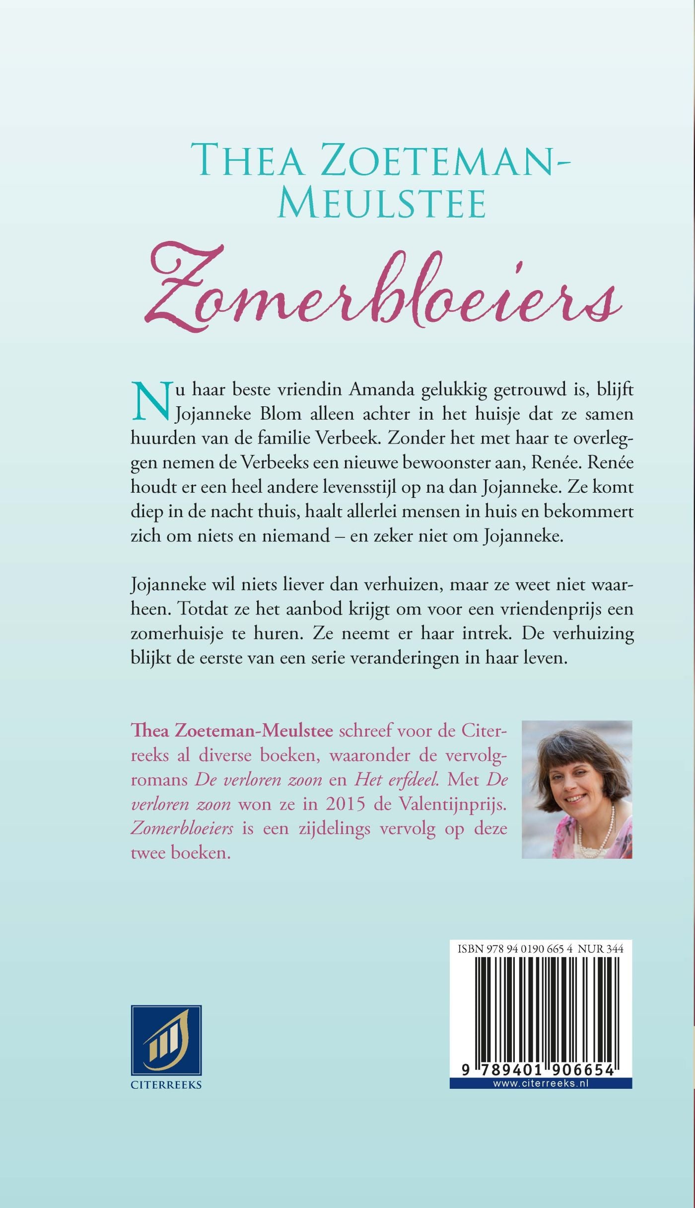 Zomerbloeiers van Thea Zoeteman-Meulstee gaat verder waar De verloren zoon en Het erfdeel ophielden. In dit boek staat de nieuwe hoofdpersoon Jojanneke centraal. Zij krijgt een nieuwe huisgenoot met wie ze het totaal niet kan vinden. Jojanneke gaat op zoek naar nieuwe woonruimte en vindt een zomerhuisje op het boerenerf van Marten en Amanda, die we kennen uit de vorige boeken van Thea Zoeteman-Meulstee. Daar maakt ze ook kennis met veearts Jouke en loonwerker Daan, die allebei van haar gecharmeerd zijn. Zomerbloeiers is een optimistische roman met veel oog voor wat mooi en goed is in het leven. Met recht een fijn boek.