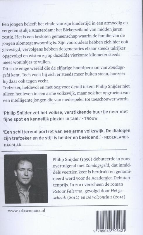 Zijn voorouders hebben zich hier ooit gevestigd, vervolgens hebben de generaties elkaar steeds talrijker opgevolgd en wisten zij op dezelfde vierkante kilometer steeds meer woninkjes te vullen. Dit is de enige wereld die de elfjarige hoofdpersoon van Zondagsgeld kent. Toch voelt hij zich er steeds meer buiten staan, hoezeer hij daar ook tegen vecht. Trefzeker, liefdevol en met oog voor detail tekent Philip Snijder niet alleen het leven in een arme volkswijk, maar ook het opgroeien van een intelligente jongen die van medespeler tot toeschouwer wordt.