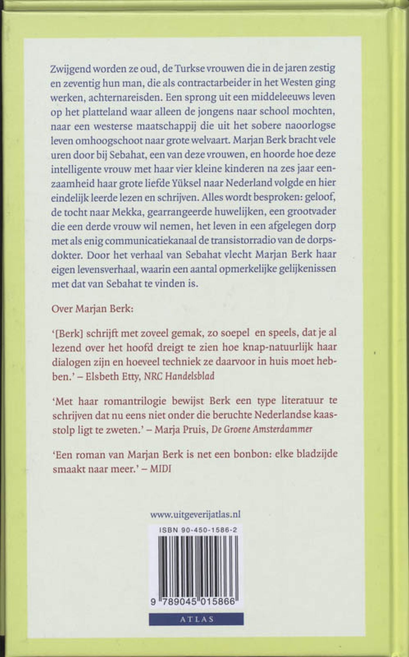 Zwijgend worden ze oud, de Turkse vrouwen die in de jaren zestig en zeventig hun man, die als contractarbeider in het Westen ging werken, achternareisden. Een sprong uit een middeleeuws leven op het platteland waar alleen de jongens naar school mochten, naar een westerse maatschappij die uit het sobere naoorlogse leven omhoogschoot naar grote welvaart. Marjan Berk bracht vele uren door bij Sebahat, een van deze vrouwen, en hoorde hoe deze intelligente vrouw met haar vier kleine kinderen na zes jaar eenzaamheid haar grote liefde Yüksel naar Nederland volgde en hier eindelijk leerde lezen en schrijven. Alles wordt besproken: geloof, de tocht naar Mekka, gearrangeerde huwelijken, een grootvader die een derde vrouw wil nemen, het leven in een afgelegen dorp met als enig communicatiekanaal de transistorradio van de dorpsdokter. Door het verhaal van Sebahat vlecht Marjan Berk haar eigen levensverhaal, waarin een aantal opmerkelijke gelijkenissen met dat van Sebahat te vinden is.