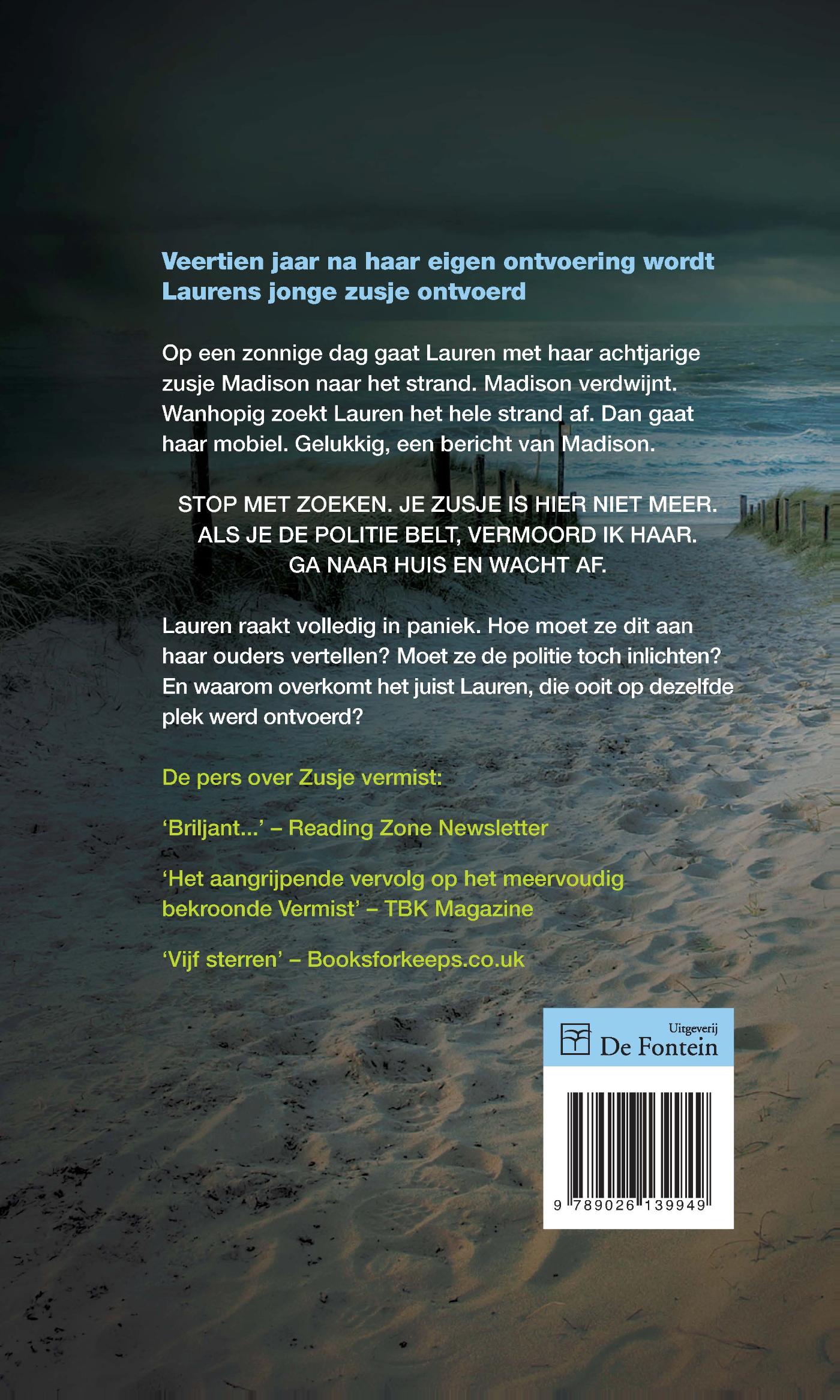 'Zusje vermist' van Sophie McKenzie is het spannende vervolg op het bloedstollende 'Vermist'. Op een zonnige dag gaat Lauren met haar achtjarige zusje Madison naar het strand. Daar verdwijnt Madison. Lauren raakt totaal in paniek. Hoe moet ze dit haar ouders vertellen? Moet ze de politie toch inlichten? En waarom overkomt het juist Lauren, die ooit op dezelfde plek werd ontvoerd? ‘Het aangrijpende vervolg op het meervoudig bekroonde Vermist’ – TBK Magazine'