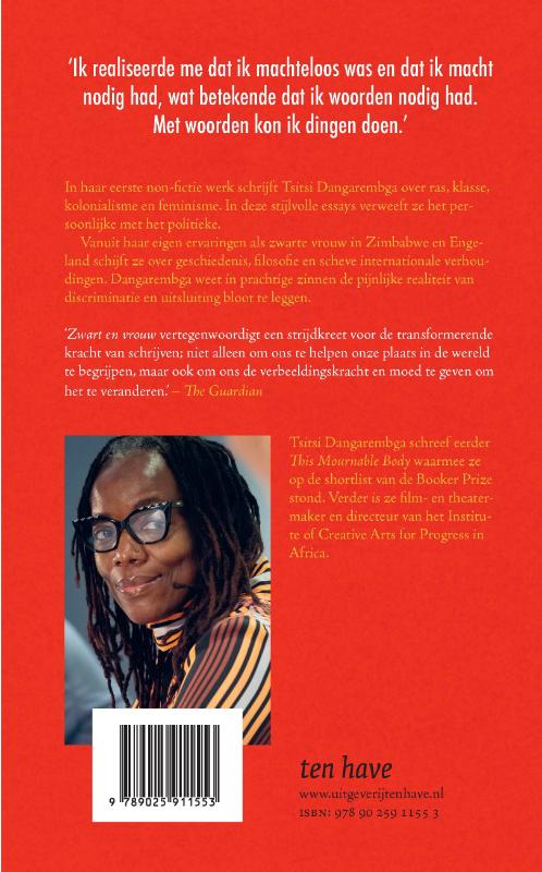 ‘Zwart en vrouw is Dangarembga’s eerste non-fictiewerk en een strijdkreet voor de transformerende kracht van schrijven; niet alleen om ons te helpen onze plaats in de wereld te begrijpen, maar om ons de verbeeldingskracht en moed te geven om die te veranderen’ – The Guardian